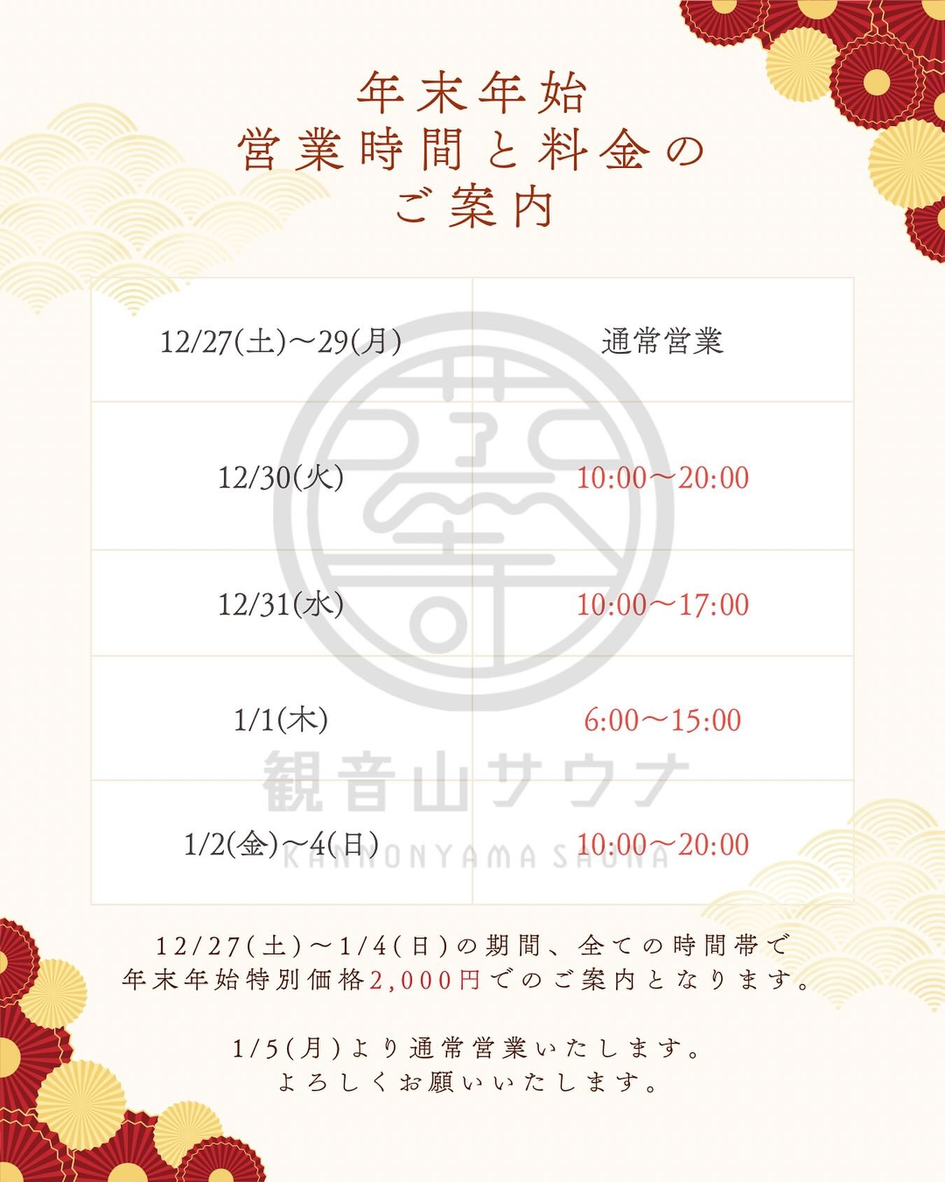 年末年始の営業時間、料金についてのご案内させていただきます。
