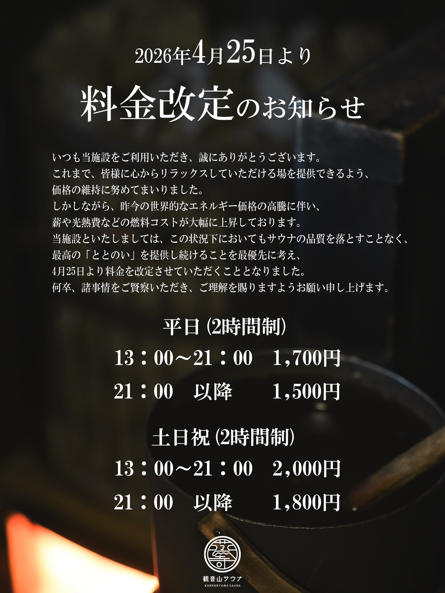 当施設といたしましては、この状況下においてもサウナの品質を落とすことなく、最高の「ととのい」を提供し続けることを最優先に考え、4月25日より料金を改定させていただくこととなりました。
